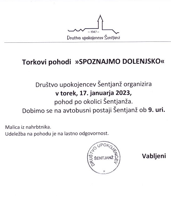 TORKOVI POHODI SPOZNAJMO DOLENJSKO – DU ŠENTJANŽ